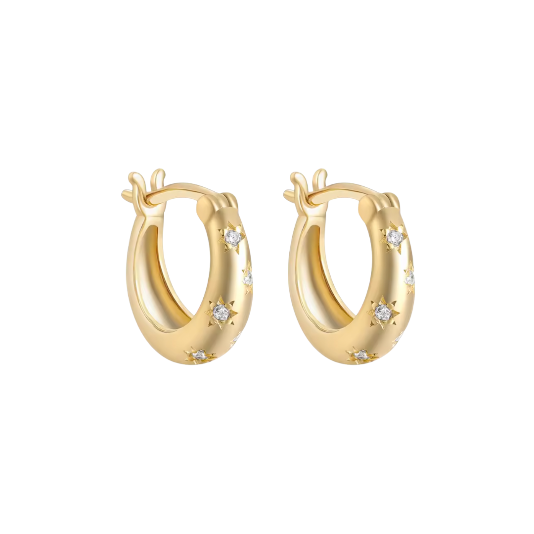 Shine with celestial elegance. These huggie hoops are adorned with delicate star-shaped engravings, each set with sparkling cubic zirconia stones that catch the light beautifully.